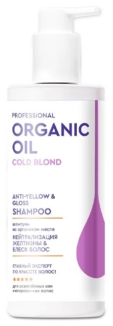 №4365 Professional Organic Oil Cold Blond Anti-Yellow & Gloss Shampoo Идеальный блонд — это просто с профессиональным шампунем Organic Oil Professional. Роскошная формула на аргановом масле с комплексом пигментов для нейтрализации желтизны осветлённых и мелированных волос. Шампунь придает волосам блеск и благородный холодный оттенок, мягко очищает и помогает волосам сохранить ухоженный вид
