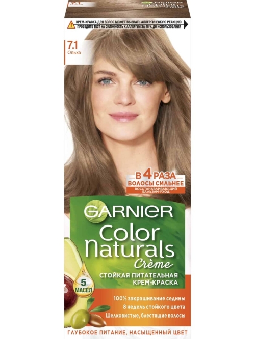 №7157 Garnier Color Naturals Creme 7.1 Кремовая формула Color Naturals Crème проникает глубоко внутрь волоса, питает его во время окрашивания и наполняет насыщенным цветом. Цвет сохраняется до 8 недель.* Обеспечивает 100% закрашивание седины.* В 4 раза волосы сильнее благодаря восстанавливающему бальзам-уходу с 5 маслами натурального происхождения: авокадо, оливы, ши, клюквы и арганы. Шелковистые, блестящие волосы. Глубокое питание, насыщенный цвет.