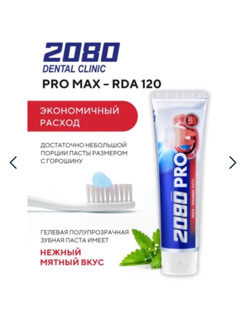 №9457 2080 Dental clinic зубная паста pro max Профессиональная зубная паста с высокой степенью образивности RDA-120- означает полировку. Аминокислоты и витаминный комплекс для здоровых десен, активный фтор защищает от повреждения зубной эмали. Эффективно удаляет зубной налет, зубной камень, остатки пищи и неприятный запах. Полирует и отбеливает зубы, не стирая эмаль. Подходит для ежедневного применения.