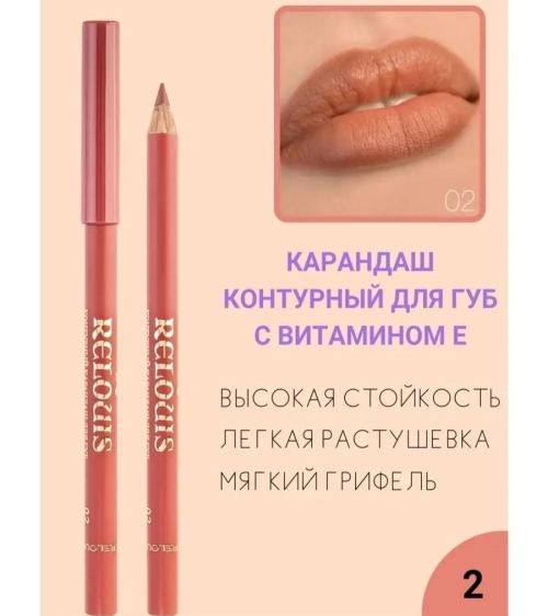 №4214 Relouis контурный карандаш для губ с витамином Е 02 Контурный карандаш для губ с витамином Е, изящный, очень удобный и стойкий. Прекрасное скольжение карандаша, его великолепная устойчивость помогают легко создать и надолго сохранить обозначенный контур губ. Вы также можете использовать карандаш как самостоятельное средство, нанося его как помаду. Для этого аккуратно обведите контур губ любимым оттенком и после заполните губы карандашом внутри для совершенного образа. Стойкая текстура карандаша и мягкое нанесение подарят вам равномерный плотный оттенок и идеальные губы в течение всего дня!