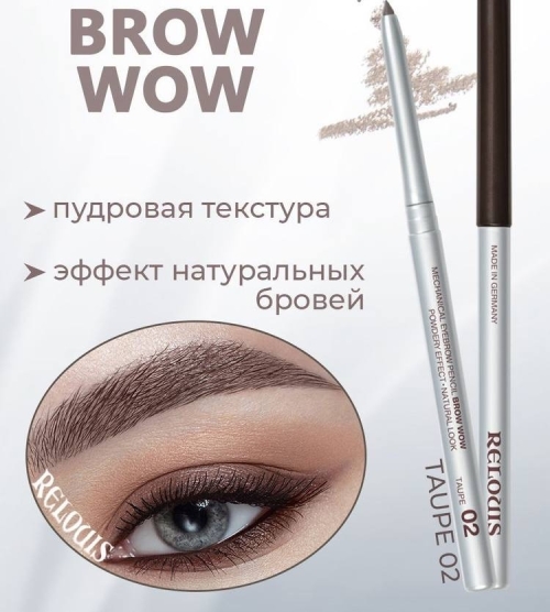 №3572 Relouis механический карандаш для бровей BROW WOW 02 taupe BROW WOW КАРАНДАШ МЕХАНИЧЕСКИЙ ДЛЯ БРОВЕЙ Особая пудровая текстура не требует дополнительной растушевки. — обеспечивает эффект естественных натуральных бровей, выразительных и ухоженных. — обеспечивает насыщенность и однородность цвета. — не нужно затачивать.
