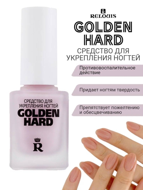 №6366 Relouis средство для укрепления ногтей Golden hard Описание средства Relouis Golden Hard:Комплексно влияет на тонкие, ломкие, слоящиеся и повреждённые ногти. Питает, устраняет признаки обезвоживания, активизирует обмен веществ и одновременно защищает ногтевые пластины от агрессивного влияния внешних факторов.