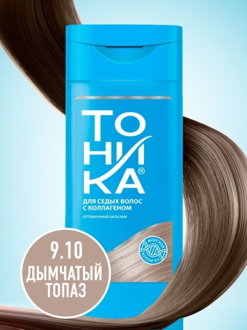 №3629 Тоника 9.10 Оттеночный бальзам ДЫМЧАТЫЙ ТОПАЗ 150мл. Оттеночный бальзам 9.10 Дымчатый топаз подчеркивает благородство природной седины, придает волосам пастельный оттенок с холодным подтоном. Высокая концентрация пигментов обеспечивает стойкое тонирование седины. Формула с морским коллагеном кондиционирует волосы, делая их более гладкими и послушными.