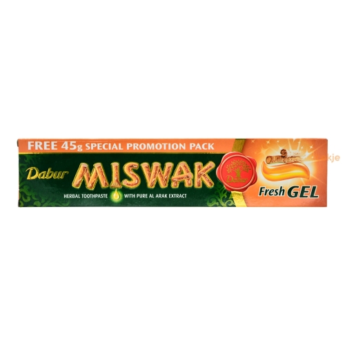№4748 Зубная паста Dabur Miswak Fresh Gel с экстрактом мисвака 90+45 г Зубная паста-гель Dabur Miswak Fresh Gel теперь доступна в формате. Новый Miswak Fresh Gel является прекрасным антибактериальным средством, профилактикой кариеса, обеспечивает здоровье десен, сильные зубы от самих корней и свежее дыхание.