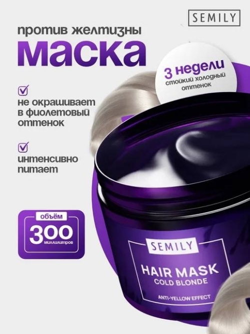 №3615 Semily Маска для волос для нейтрализации желтизны Оттеночная маска интенсивно питает волосы и восстанавливает холодный оттенок блонда, нейтрализует жёлтые пигменты и продлевает насыщенность цвета после окрашивания. Тонирующая маска от желтизны идеально подходит для всех типов блонда: классического, пепельного, жемчужного, платинового, а также для мелированных, седых и обесцвеченных волос. Мягкое тонирование волос происходит благодаря питательной формуле с натуральным маслом кокоса, экстрактом авокадо и протеинами кашемира. Нейтрализатор желтизны увлажняет волосы по всей длине и укрепляет структуру окрашенных локонов, предотвращая ломкость и сухость.