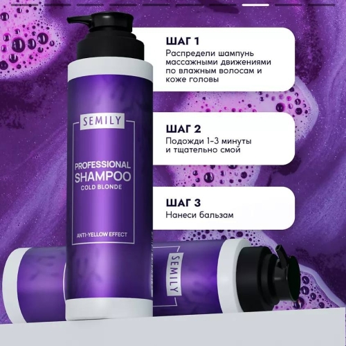 №4133 Semily шампунь против желтизны волос холодный блонд, 400 мл Шампунь для волос против желтизны устраняет тёплые тона, сохраняя светлый холодный блонд. Антижелтый шампунь универсален для разных типов волос и оттенков, включая платиновый, пепельный и жемчужный блонд, а также подходит для обесцвеченных и седых волос. За счёт содержания фиолетовых пигментов средство нейтрализует желтый оттенок и поддерживает насыщенный светлый цвет на окрашенных волосах. Шампунь для блондинок с протеинами кашемира делает волосы гладкими и послушными, дарит эффект легкого расчесывания и предотвращает появление секущихся кончиков. Средство действенно очищает кожу головы, не пересушивая эпидермис. Насыщенная формула улучшает состояние волос блонда, действует против ломкости и пушистости, а также защищает локоны от повреждений во время окрашивания. Рекомендуется использовать вместе с бальзамом для нейтрализации желтизны. Semily — профессиональный уход за волосами.