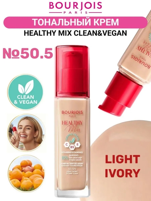 №6773 Bourjois Тональный крем Healthy Mix тон 50,5N Тональный крем Bourjois Healthy Mix Foundation. Мягкая и легкая текстура витаминно-фруктовой тональной основы Healthy Mix скрывает недостатки, помогая достичь сияющего, безупречного цвета лица благодаря формуле, обогащенной витаминами. Тональный крем усиливает естественное сияние, улучшает эластичность кожи, визуально сокращает глубину морщинок. Эффект сияния и увлажнения продлится в течение 8 часов.