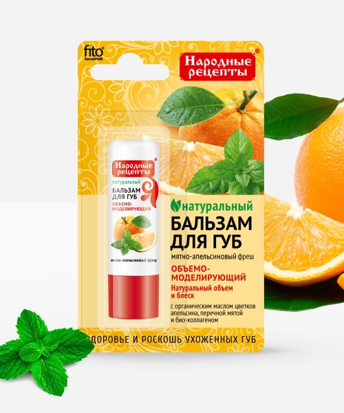№7895 Народные рецепты мятно апельсиновый фреш бальзам Натуральная формула бальзама, обогащенная органическим маслом цветков апельсина, экстрактом перечной мяты и био-коллагеном глубоко увлажняет, укрепляет, тонизирует кожу губ, придает натуральный объем, соблазнительный блеск и делает контур губ более четким.