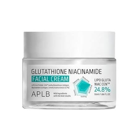 №7759 APLB Glutathione Niacinamide Facial Cream Осветляющий крем с глутатионом и ниацинамидом APLB Glutathione Niacinamide Facial Cream предупреждает появление пигментации и постакне, выравнивает тон кожи и придаёт естественное сияние. Средство восстанавливает гидролипидный барьер, увлажняет, питает, уменьшает выраженность мимических морщин и заломов. Обладает успокаивающим действием. Содержит глутатион, ниацинамид, комплекс центеллы азиатской, экстракт полыни, лотоса, трегалозу и витамин С.