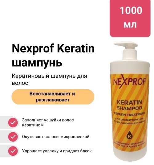 №2369 Nexprof Keratin шампунь 1000 мл Натуральный кератин содержащийся в препарате заполнит чешуйки волос. Интеллектуальная формула позволяет распознавать и заполнять кератином пораженные участи волоса, а протеиновая микропленка окутает волос снаружи, сделав его тяжелым и гладким. Если у вас непослушные вьющиеся волосы, то кератиновая реконструкция волос не только значительно упростит процедуру ежедневной укладки, но и сделает ваши волосы шелковистыми, гладкими и блестящими.