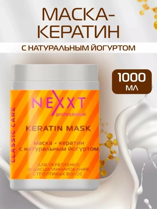 №2253 Nexprof Professional Маска - кератин для волос профессиональная с натуральным йогуртом 1000ml Увлажняющая профессиональная маска для укрепления волос NEXXT Professional для восстановления структуры, реанимации сожжённых химическими процедурами (окрашиванием и химической завивкой), температурным воздействием волос. Улучшает состояние волос всего за одну процедуру. Маска содержит протеиновый комплекс, являющийся основой структуры волоса, укрепляет кератиновые сцепки, заполняет поры волоса, насыщает его белками. Усиливает волосы, восполняет пустоты между чешуйками волоса, возвращает блеск. Натуральный йогурт содержит белки сыворотки, лактозу, молочную кислоту, витамины А и В, минералы, низкомолекулярные жиры.
